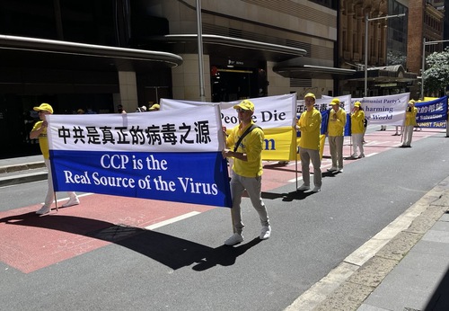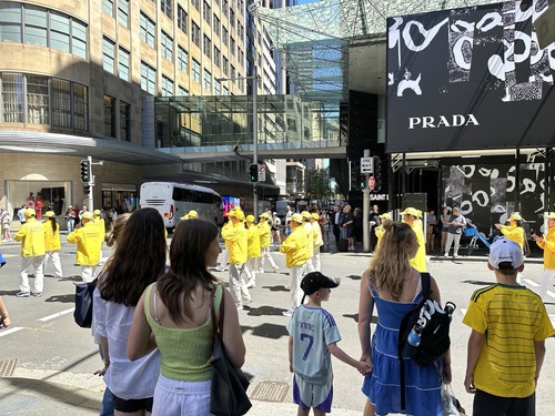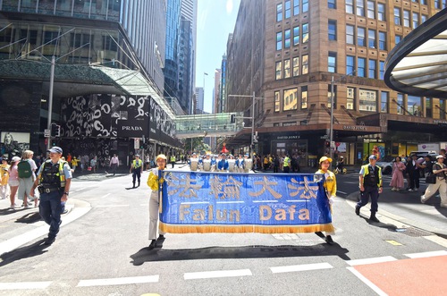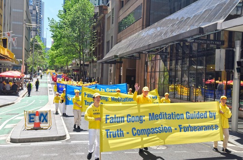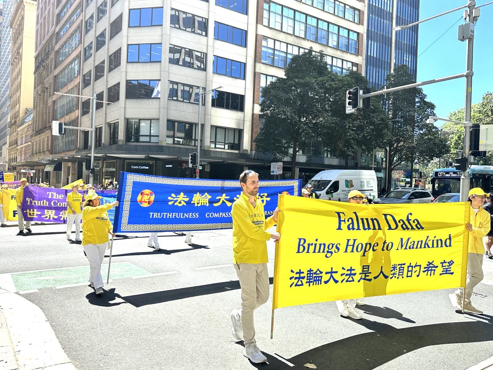 (Minghui.org) Practitioners held a march in the center of Sydney’s financial district on October 10, 2025, to introduce the principles of Truthfulness, Compassion, and Forbearance to the public. They also raised awareness of the Chinese Communist Party’s (CCP) 26-year-long persecution of Falun Dafa (also known as Falun Gong) in China.