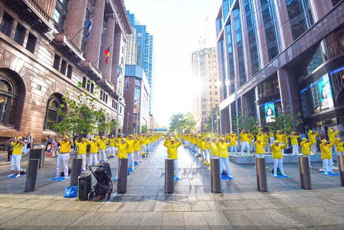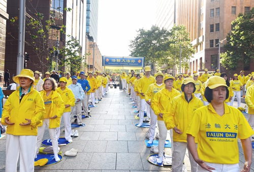 Falun Dafa practitioners from across Australia hold a large group practice on Martin Place in Sydney on October 10, 2025.