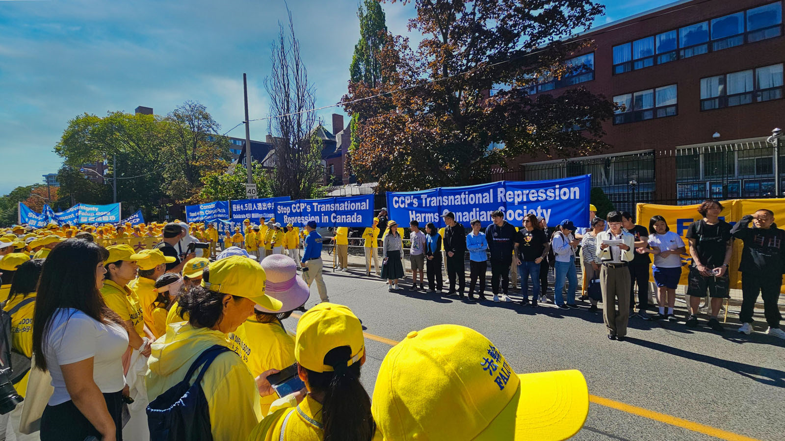 (Minghui.org) Falun Gong practitioners and democracy advocates held a rally in front of the Chinese Consulate in Toronto on September 28, 2025. They condemned the Chinese Communist Party’s (CCP) persecution of Falun Gong (also known as Falun Dafa) and called for help to stop the CCP’s transnational repression in Canada.