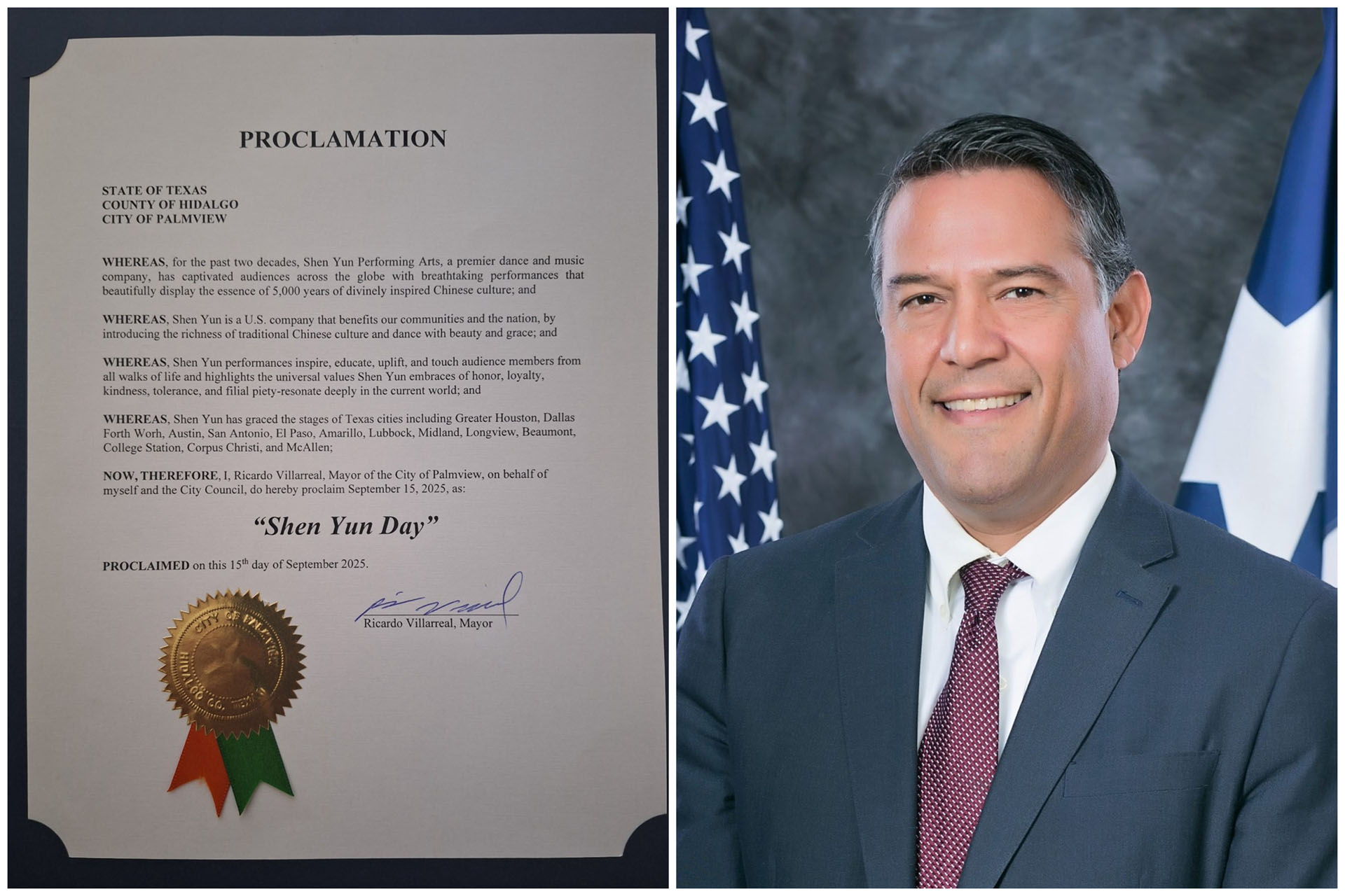 Ricardo Villarreal, Mayor of the City of Palmview, proclaimed September 15, 2025, “Shen Yun Day” in the city.