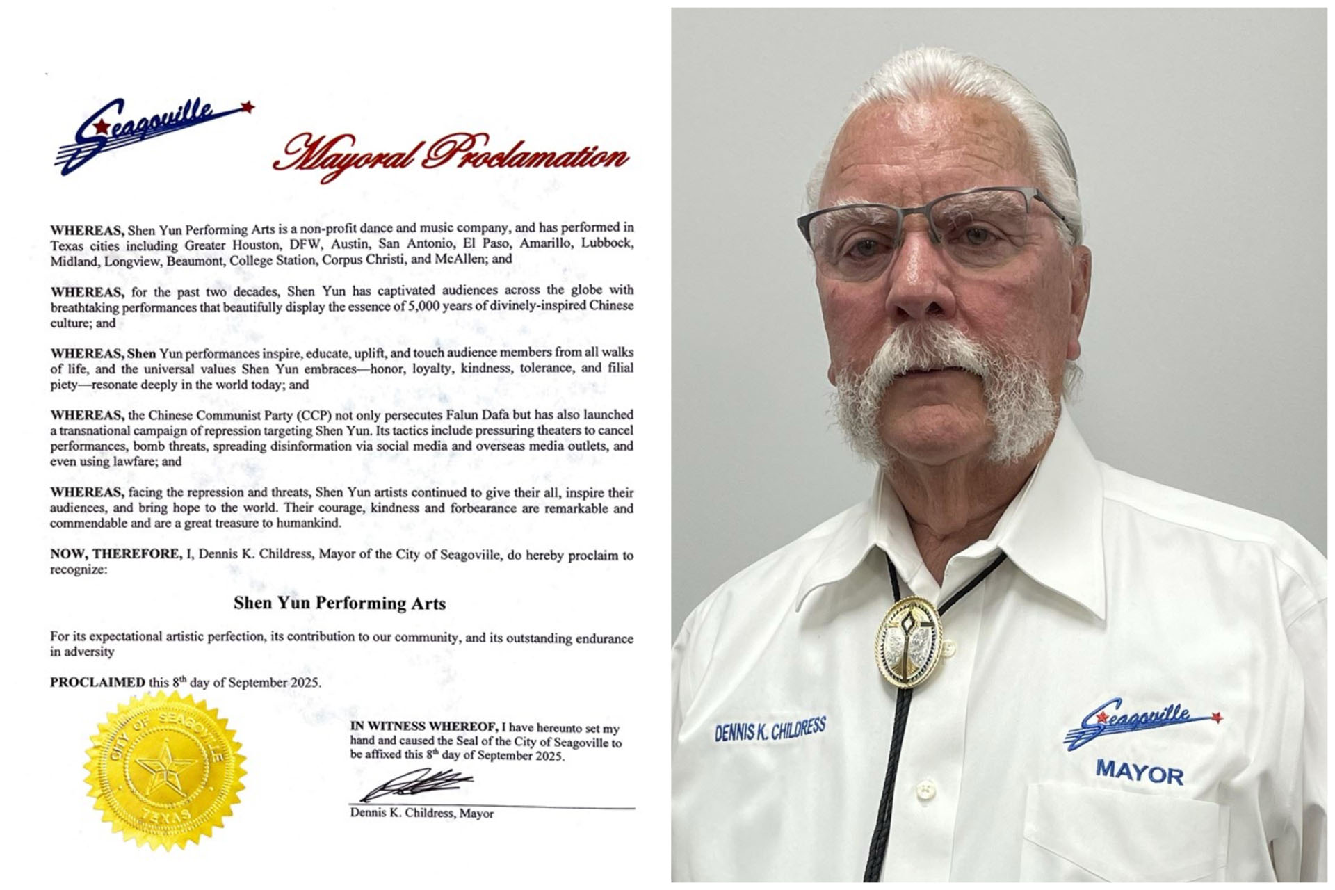 Dennis K. Childress, Mayor of the City of Seagoville, issued a proclamation for Shen Yun on September 8.