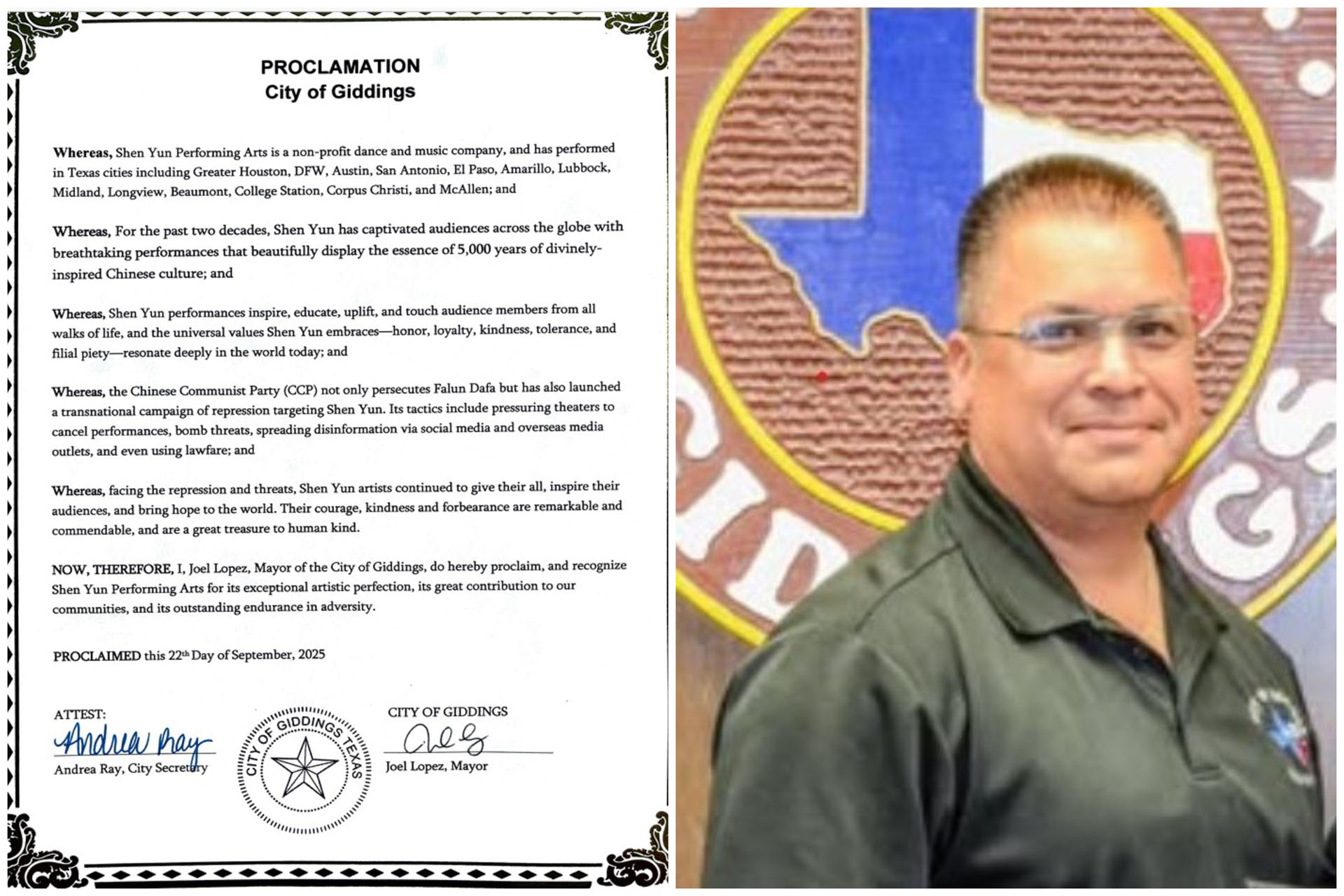 Mayor Joel Lopez of Giddings issued a proclamation for Shen Yun Performing Arts on September 22, 2025, praising Shen Yun for showcasing the essence of divinely inspired culture with exquisite performances, benefiting the community and the country. He also praised Shen Yun artists for their courage and kindness in the face of the Chinese Communist Party’s (CCP) transnational repression.
