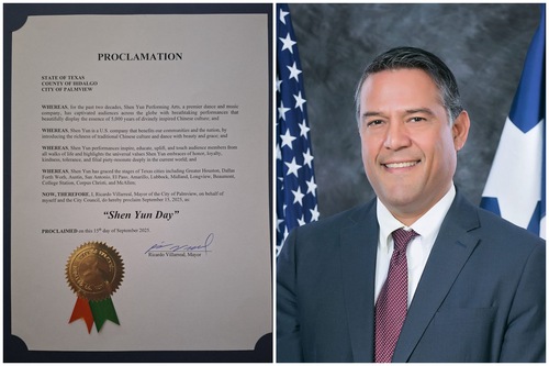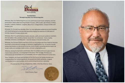Ricardo Villarreal, Mayor of Palmview, Texas, proclaimed September 15, 2025, “Shen Yun Day” in the city. On the same day, David Moreno, Mayor of Donna, Texas, issued a proclamation for Shen Yun, recognizing its remarkable resilience in the face of adversity and its great contributions to the community through its exceptional and refined artistry.