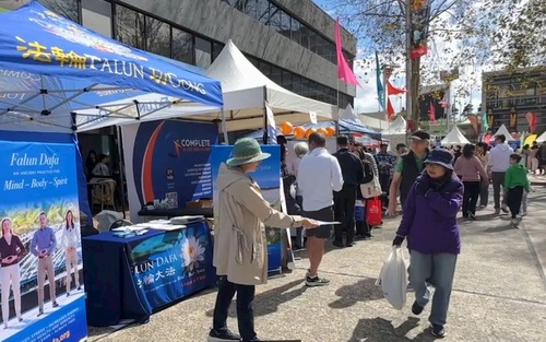 Practitioners demonstrated the exercises at their booth, and many people learned about Falun Dafa and took leaflets. Some said they were very interested in learning the practice and were told that local practitioners do the exercises every morning at Concord Plaza and offer free instruction.