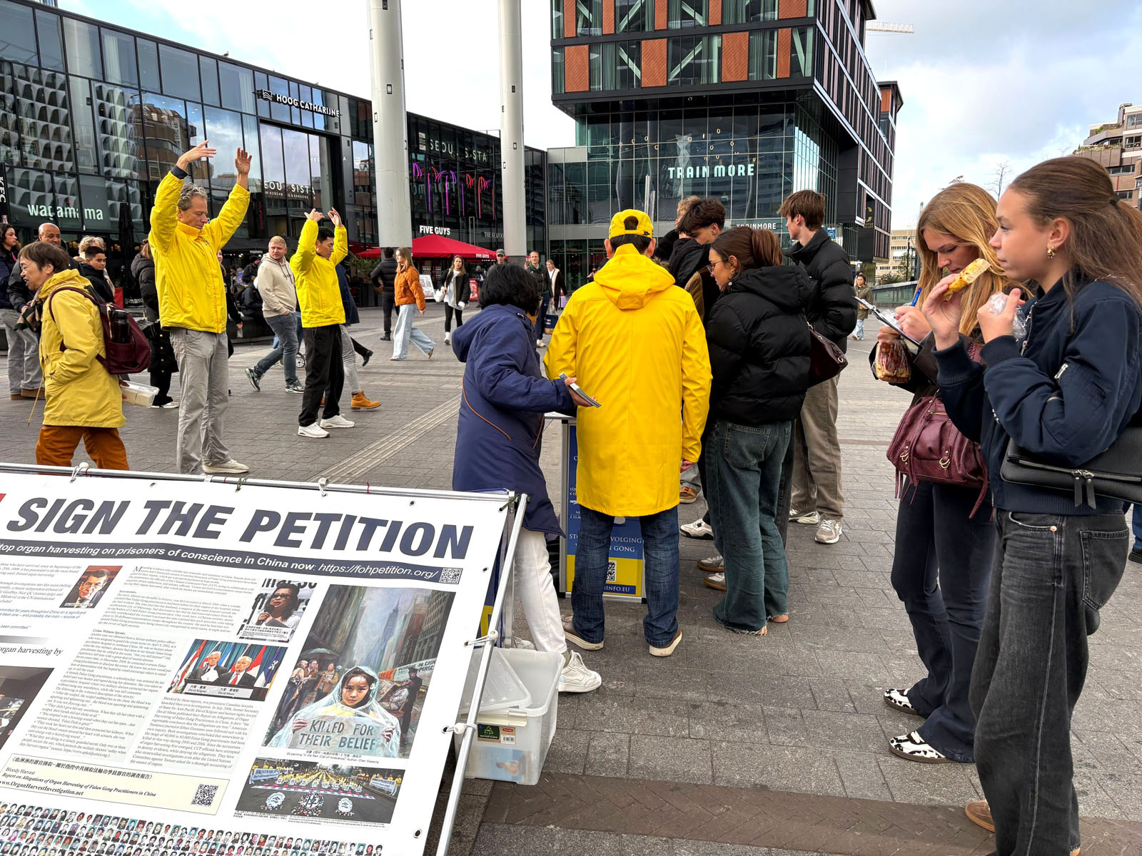 (Minghui.org) On October 26, 2025, Falun Dafa practitioners from different cities in the Netherlands held an activity near the Utrecht Central Station to tell the public about Falun Dafa and the forced organ harvesting of its practitioners in China. They set up an information booth with materials displaying the facts of the Chinese Communist Party’s (CCP) persecution. They did the Falun Dafa exercises, and collected signatures on a petition that calls on the G7+7 nations to take action to stop the CCP’s forced organ harvesting operations.