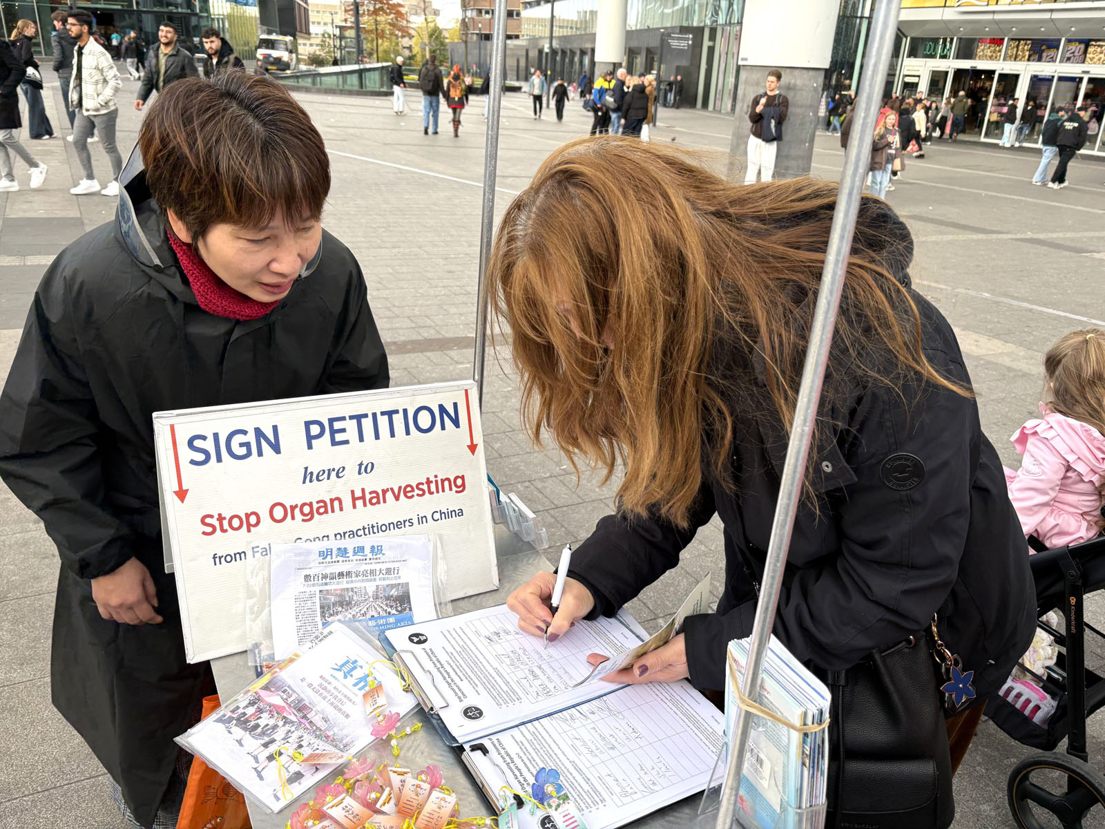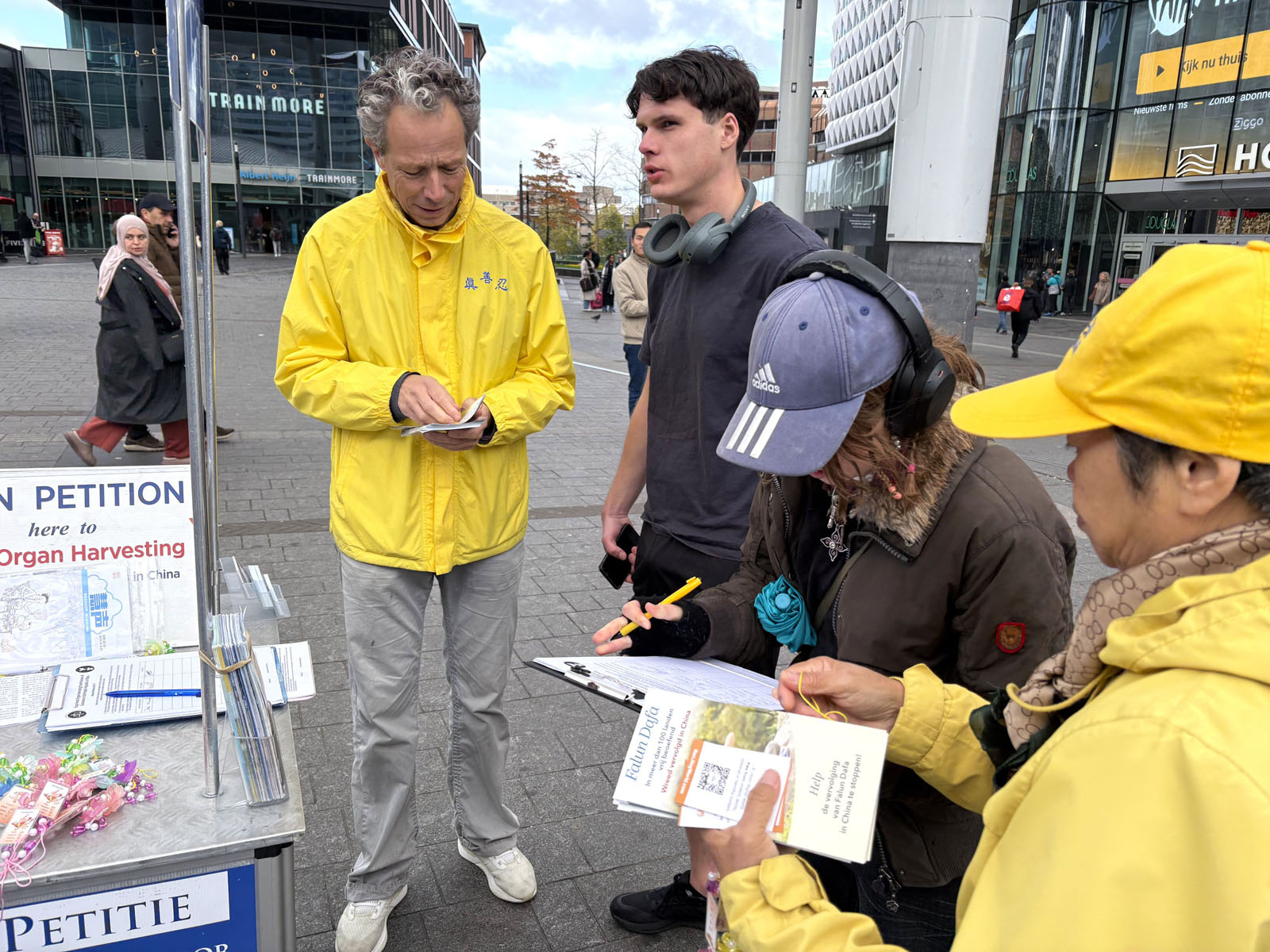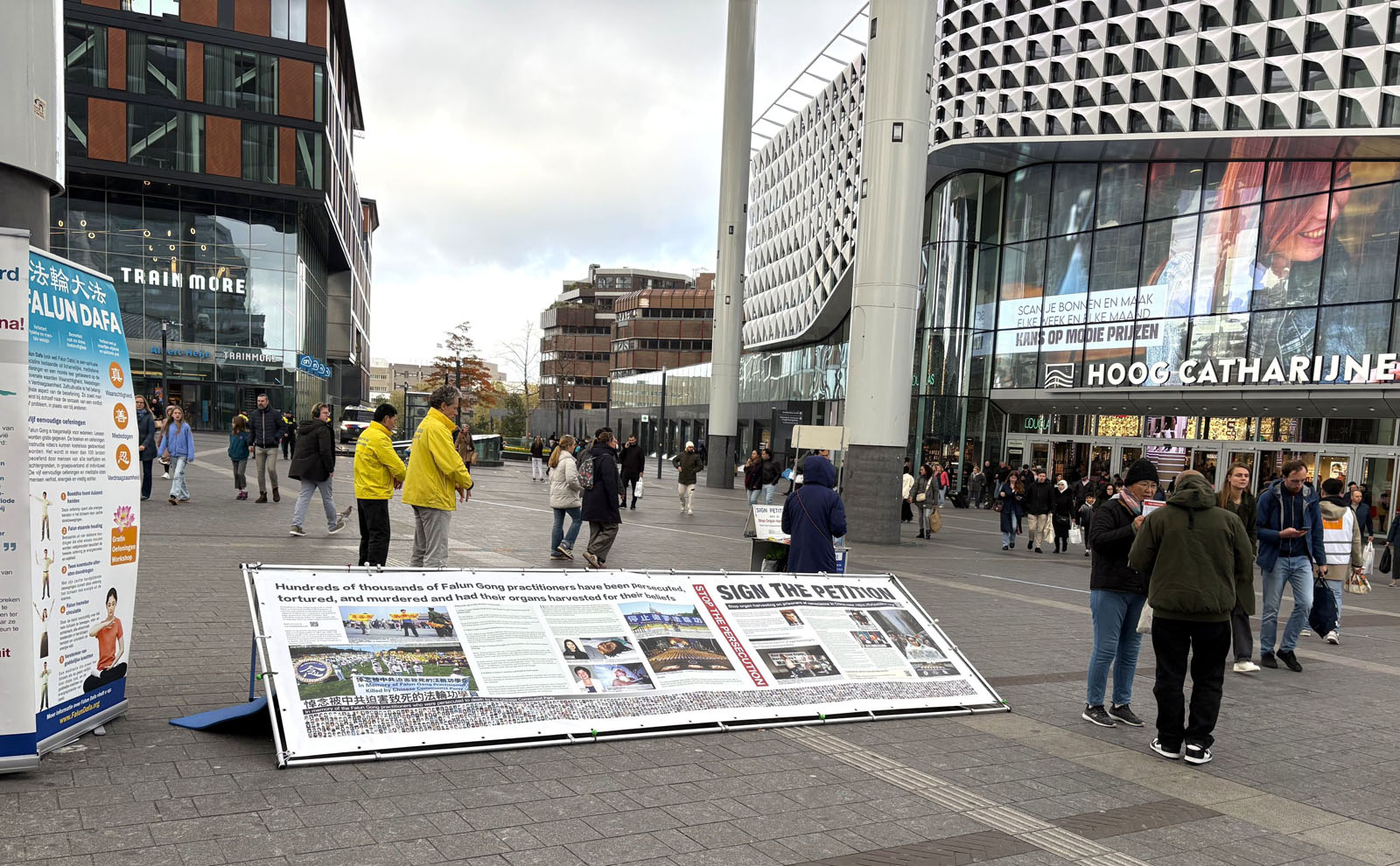 On October 26, 2025, Falun Dafa practitioners held an activity near the Utrecht Central Station to introduce Falun Dafa and raise awareness of the forced organ harvesting in China.