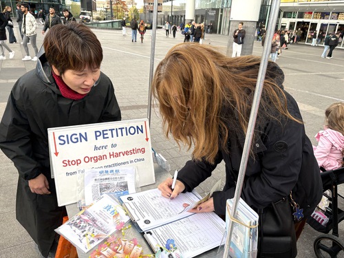 Irem Karasu is originally from Turkey and lives in Rotterdam. She stopped to read the practitioners’ large banner, which has detailed information about the persecution of Falun Dafa in China. After she learned more about the persecution she signed the petition and said she would share the petition with her relatives. “At least it encourages people with a conscience to take a look and pay attention,” she said.