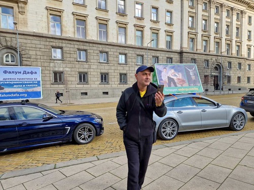 Danior, an Uzbek working in Bulgaria, took a selfie in front of the cars with messages and said, “Here in Bulgaria, you have freedom of speech, and you can say what you think and do it in front of the Presidency. Bravo for defending the human rights of these people [Falun Gong practitioners in China]!”