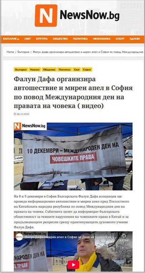 (Minghui.org) The week of December 10, 2025, International Human Rights Day, the Bulgarian Falun Dafa Association (BFDA) organized events in Sofia to tell people about the Chinese Communist Party’s (CCP) ongoing persecution in China. Online media outlet NewsNow.bg reported on the events.