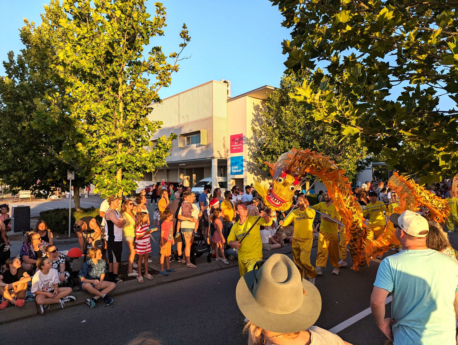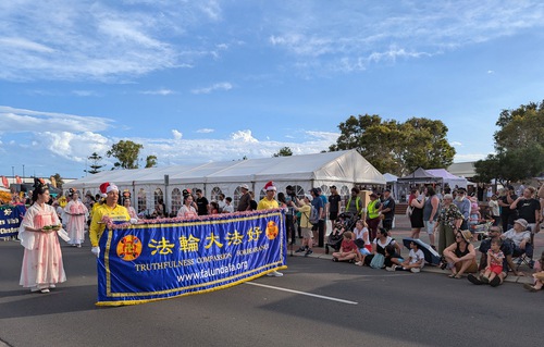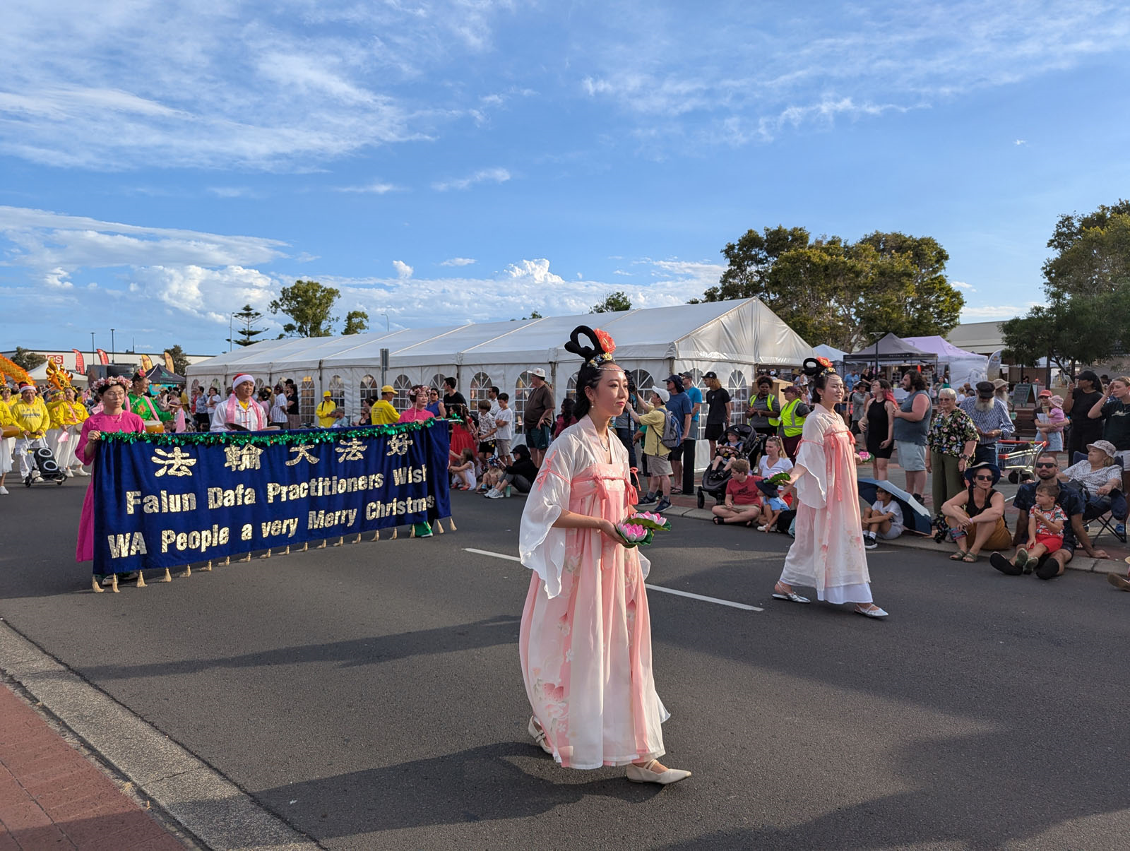 Many people praised the practitioners’ entry during the Bunbury City Christmas Parade, which was held on the evening of December 14. Their group included celestial fairies, a waist drum team, a flag team, and a Chinese dragon dance. The dazzling colors, along with the inspiring drum beats with the lively golden Chinese dragon, created a festive and auspicious atmosphere. The Chinese dragon and fairies interacted with the spectators who cheered and applauded them.
