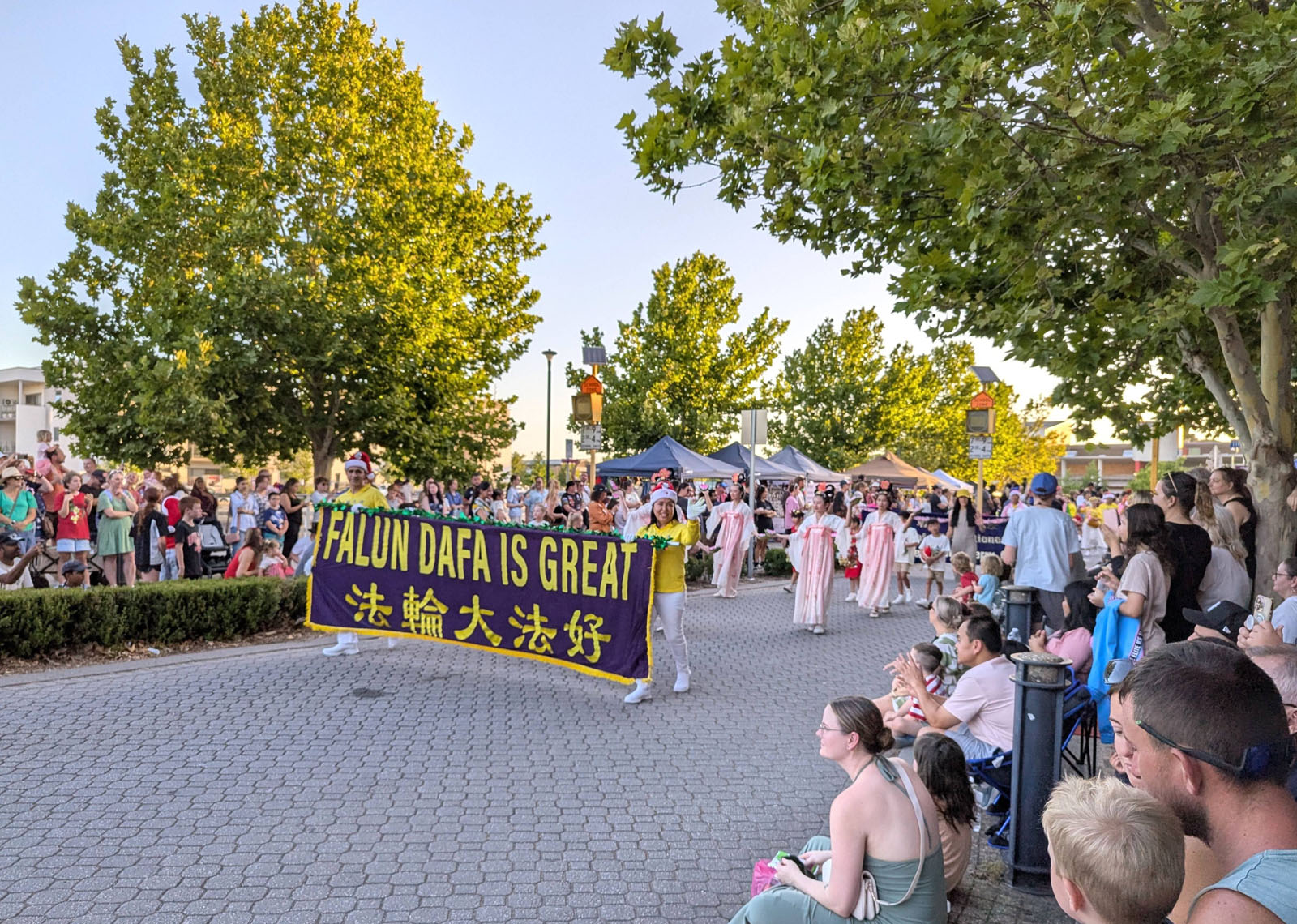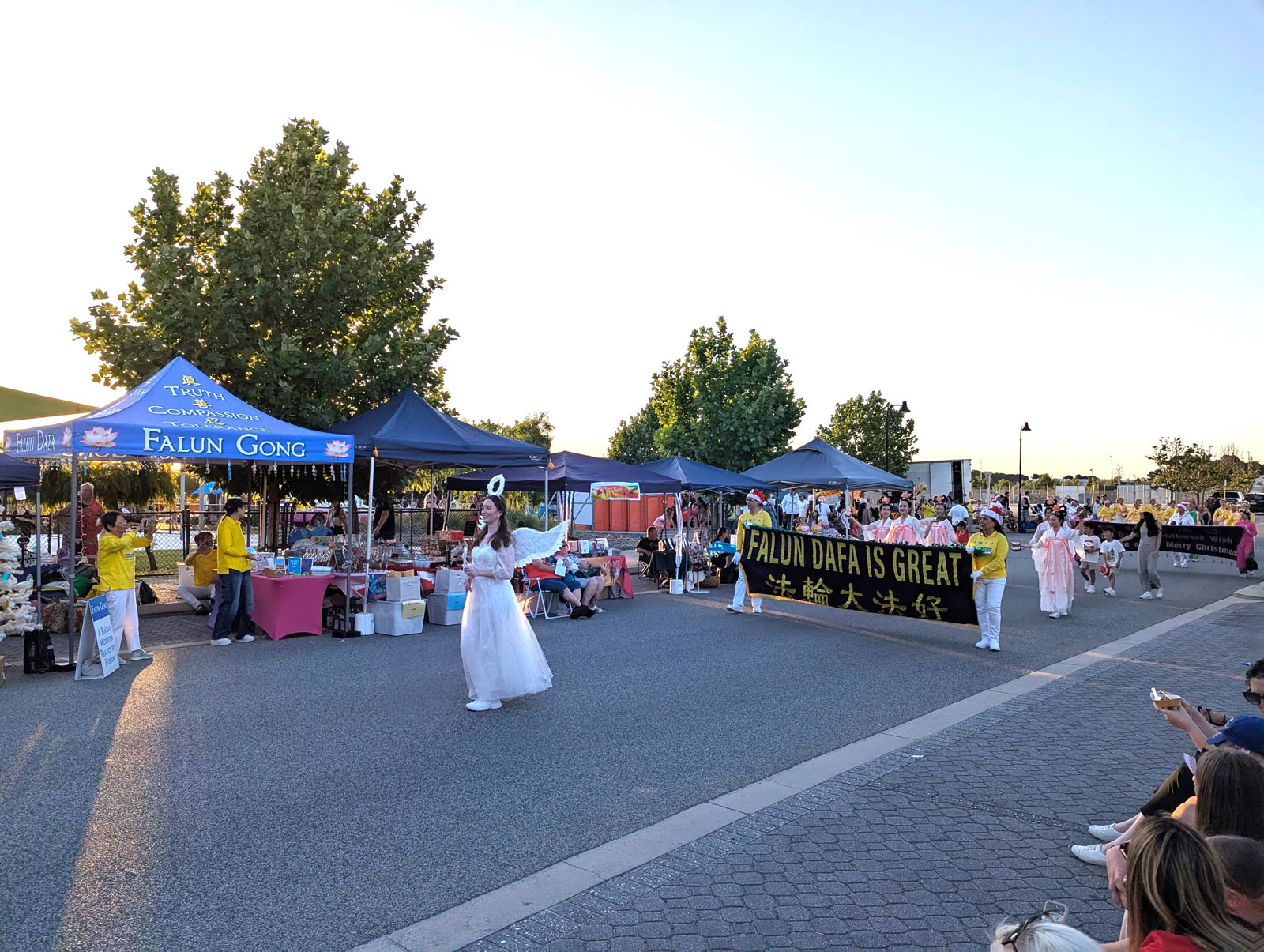 Practitioners had a booth at the Christmas festival in Ellenbrook, Perth, on Saturday, December 13, 2025. They introduced the physical and mental benefits of practicing Falun Dafa to passersby and demonstrated the exercises. Later that evening they participated in a parade and celebrated the holidays with local residents.