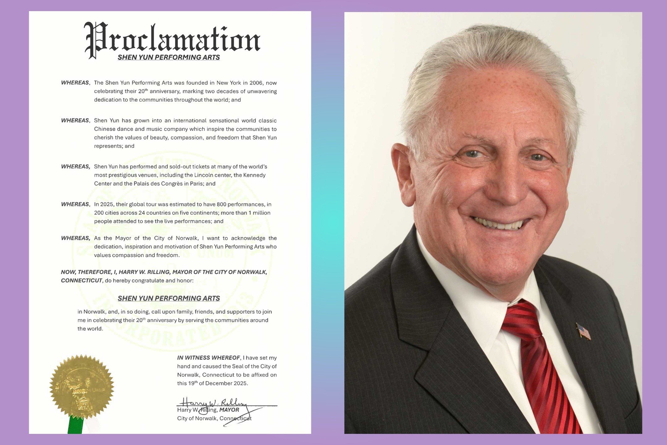 In December 2025, Mayor Harry W. Rilling of Norwalk, Connecticut issued a proclamation for Shen Yun Performing Arts.