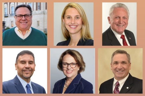 In December 2025, ahead of Shen Yun’s return to Waterbury, CT, the mayors of six Connecticut cities presented Shen Yun Performing Arts with congratulatory letters and proclamations. They are (from left to right, top to bottom): Mayor Paul K. Pernerewski, Jr. of Waterbury, Mayor Caroline Simmons of Stanford, Mayor Harry W. Rilling of Norwalk, Mayor Bobby Sanchez of New Britain, Mayor Ellen Zoppo-Sassu of Bristol, and Mayor Michael E. Passero of New London.
