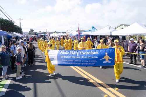 The parade began on Saturday morning at 10 a.m. Spectators on both sides of the street applauded when they saw the Falun Gong contingent. Some waved and cheered and some followed along as the practitioners demonstrated the Falun Gong exercises.