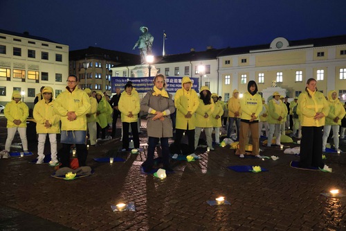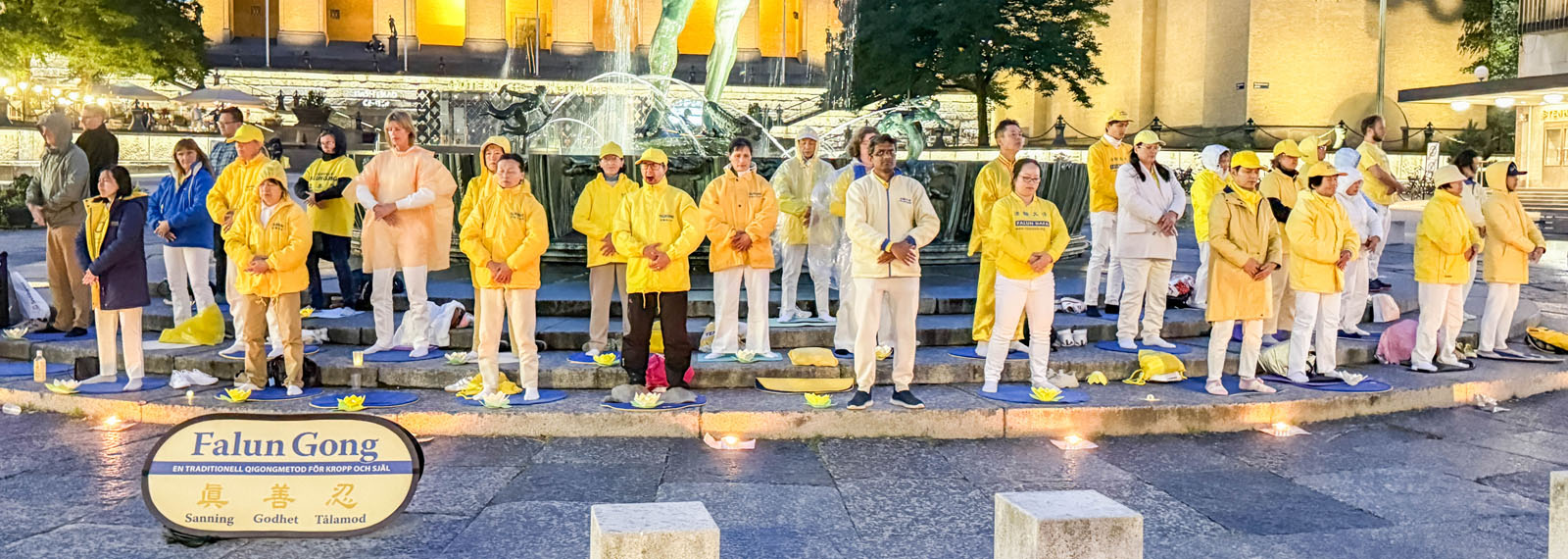 (Minghui.org) Falun Dafa (Falun Gong) practitioners held a candlelight vigil and practiced the exercises together at Gustaf Adolfs Torg in Gothenburg, Sweden, on September 19, 2025.