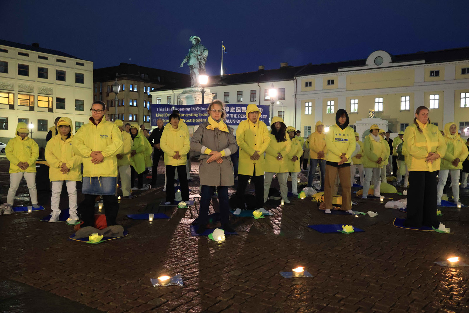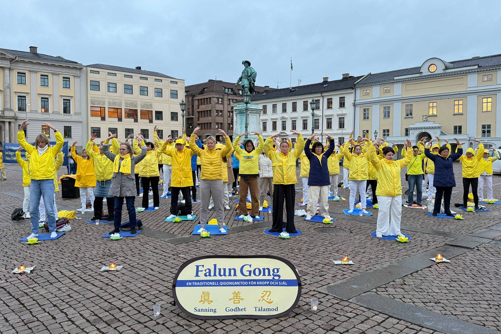 Falun Dafa practitioners held a candlelight vigil at Gustav Adolfs Torg in Gothenburg and demonstrated the exercises on September 19, 2025.