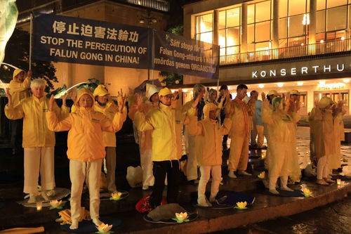 The following day, after a holding a rally and parade, Falun Gong practitioners went to Götaplatsen Square and held another candlelight vigil, on September 20. Many people coming out of a concert hall on the west side of the square saw the practitioners calmly practicing the exercises and meditating in the rain, and either accepted materials or had long conversations with the practitioners to learn more.