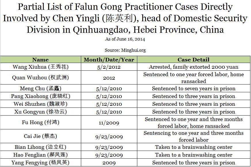 As one of main perpetrators in this case, Chen Yingli was promoted to the head of the Domestic Security Division in 2009 for actively participating in the persecution of many practitioners, including, but not limited to: