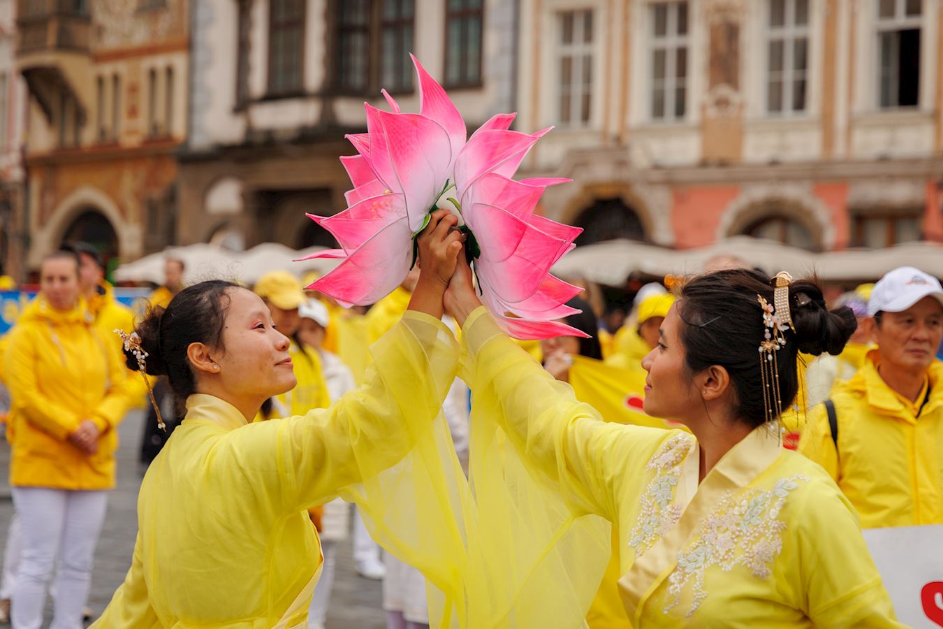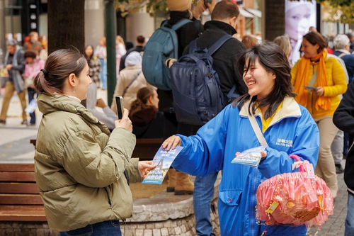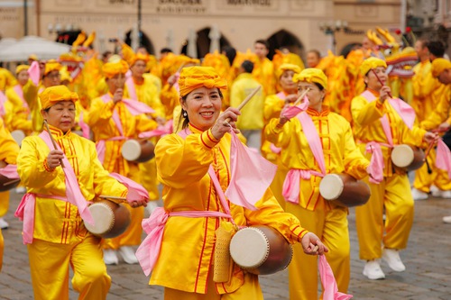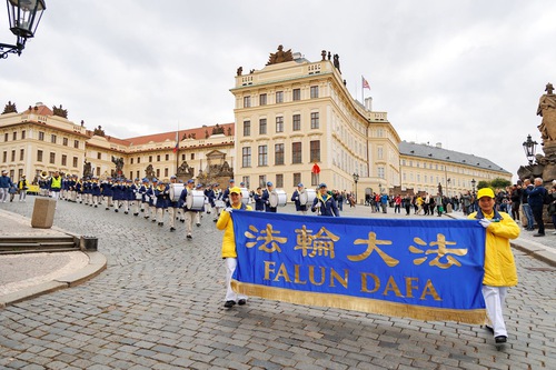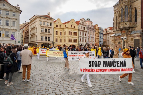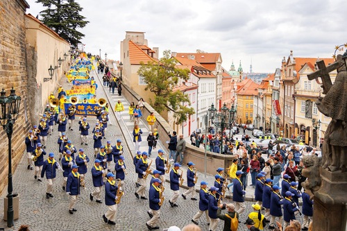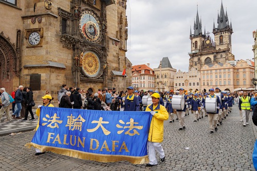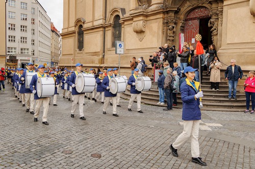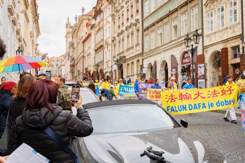 (Minghui.org) Falun Dafa practitioners held a parade through Prague, capital of the Czech Republic, on Saturday, October 11, 2025. Prague’s historic center was packed with visitors, and thousands of people learned about Falun Dafa and the Chinese Communist Party’s (CCP) persecution of practitioners in China. Several media outlets covered the event.