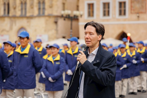 Leos Strnad, spokesperson for the Czech Falun Dafa Association, gave a speech at the Old Town Square.