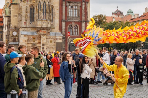 The parade began at 11 a.m. on Hradčanské Square and concluded at Old Town Square. Tourists and locals lined the streets, taking in the lively music and colorful procession. Along with the Tian Guo Marching Band, the parade included two colorful Chinese dragons, two lions, a fairy dance with origami lotus flowers, and a waist drum team. Many people recorded the event on their phones and accepted informational leaflets.