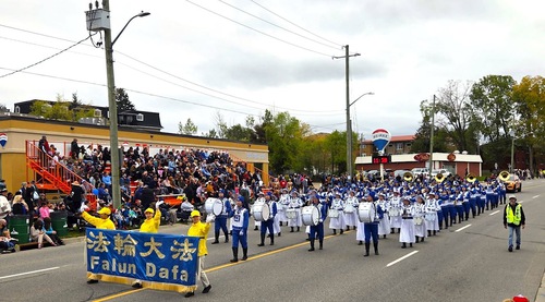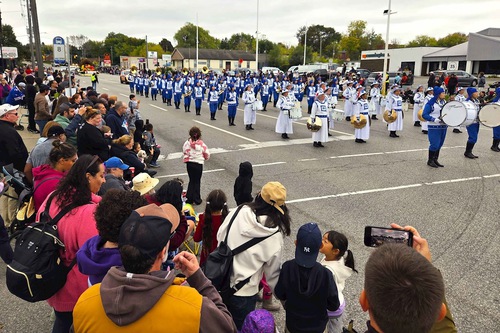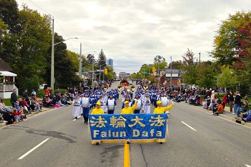(Minghui.org) The Tian Guo Marching Band from Toronto was invited to participate in the annual Kitchener-Waterloo Oktoberfest Thanksgiving Day Parade on October 13, 2025.