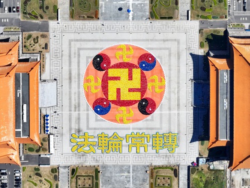 Character formation activities have been held in Taiwan for 26 years. Wu Qingxiang was responsible for designing the image and said this year’s image of the Falun emblem has a diameter of over 66 meters. This is the emblem of Falun Dafa. The four, golden, traditional Chinese characters below the emblem “The Falun Is Constantly Turning”, every character is 21 meters wide, 17 meters high. He said that every year, photos of the activity are posted online and people in China leave messages such as, “How grand!” or, “How magnificent!”