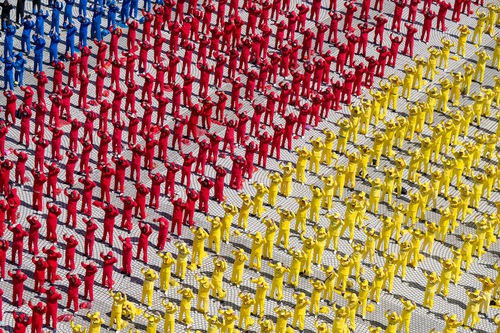 Aerial view of the Falun emblem and the characters: “Falun Rotates Constantly” formed by practitioners.