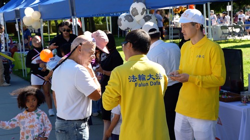 After the parade, Falun Dafa practitioners gathered in Rowland Heights Park to do the exercises and many people stopped and watched. The practitioners set up a display stand which had informational materials and small origami lotus flowers, to introduce the spiritual practice and raise awareness of the Chinese Communist Party’s (CCP) persecution of Falun Dafa practitioners in China.