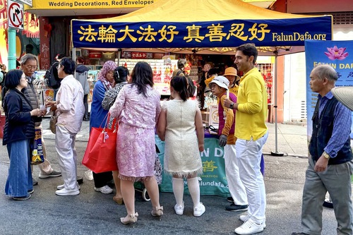 Practitioners talk with visitors about Falun Dafa and the CCP’s persecution in the Chinatown Autumn Moon Festival celebration on September 27 and 28, 2025.