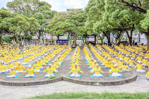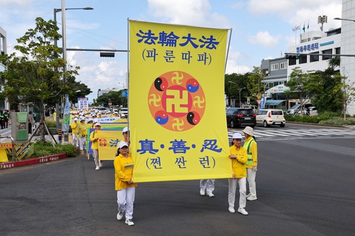 The event, hosted by the Falun Dafa Association of South Korea, was attended by practitioners from South Korea, Japan, Taiwan, Vietnam, and other countries. They did the exercises in Samda Park in Jeju City, followed by a stage performance and a parade along the main street lasting about 3 kilometers.