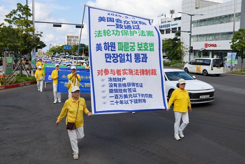 (Minghui.org) A parade to congratulate the 450 million Chinese who have withdrawn from the Chinese Communist Party (CCP) and its affiliated organizations was held on Jeju Island, South Korea, on September 21 and 22, 2025. Jeju Island is a favorite destination for Chinese tourists, offering visa-free entry and attracting a large number of visitors each year.