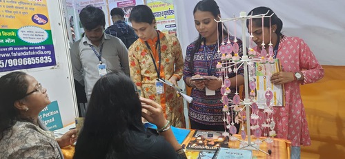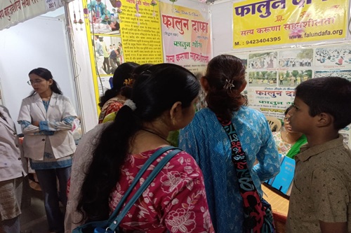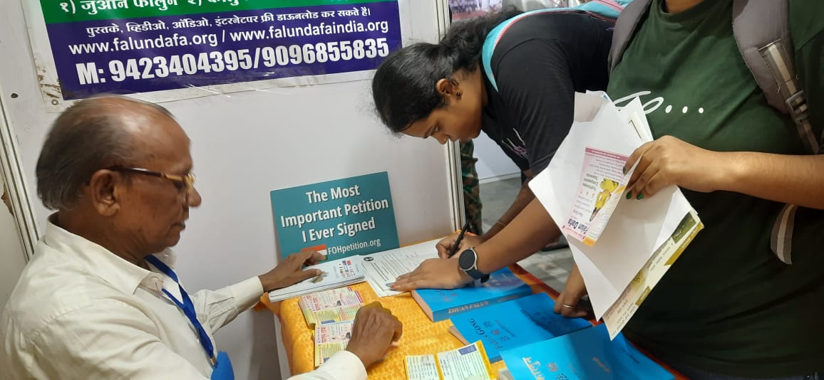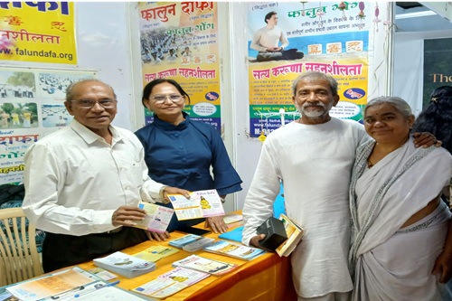 Renowned social workers Padmashri Dr. Ravindra Kolhe and Smita Kolhe, recognized for their decades of service in remote tribal areas, visited the Falun Dafa booth at the exhibition. Their presence encouraged the practitioners and brought additional visibility to the event, inspiring more visitors to learn about the practice.