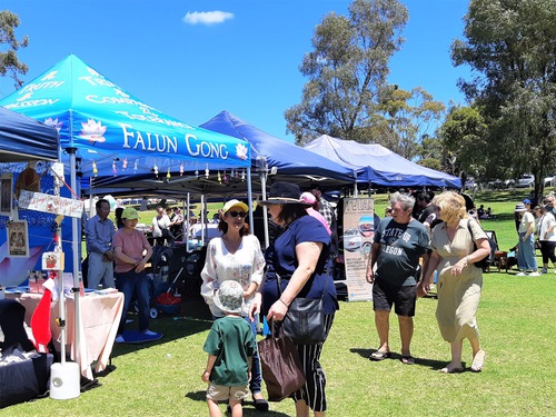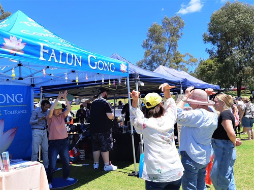 (Minghui.org) The annual Rotary Kwinana Community Fair was held in Calista, south of Perth, on November 8, 2025. There were over 100 booths. Falun Dafa practitioners set up a booth, which drew many visitors. Some people wished to learn the exercises right then.