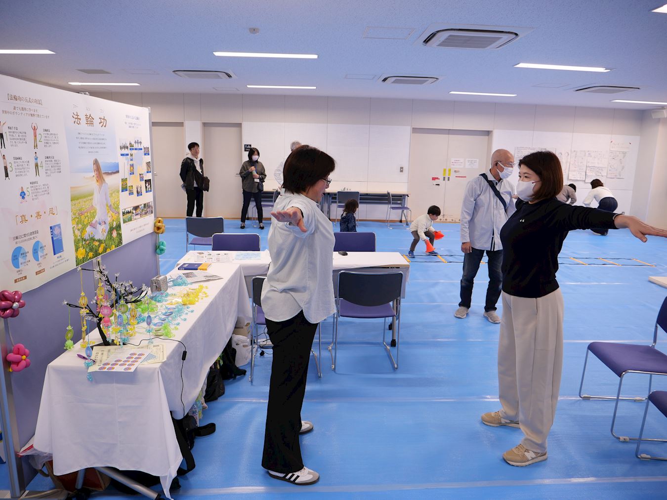 Ms. Shibuya (left, wearing blue vest) learned the Falun Dafa exercises.