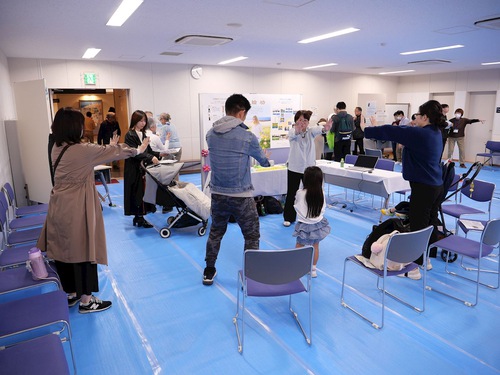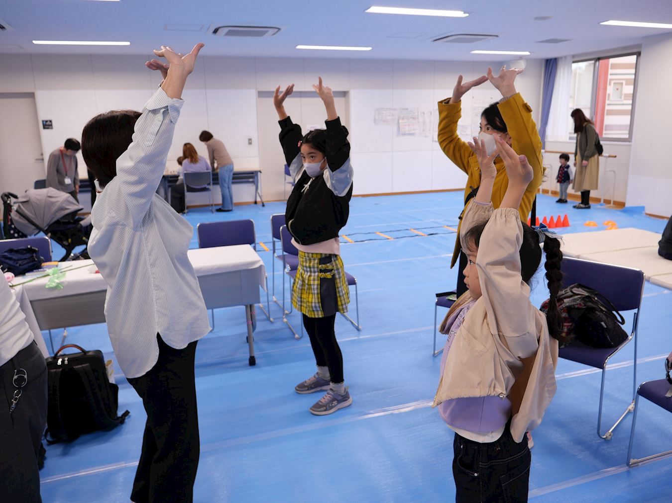 Ms. Muraoka (right, wearing a yellow coat) and children learned the exercises.