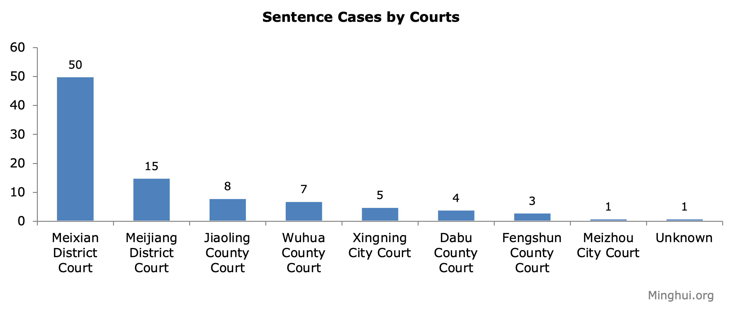 The prison sentences (totaling 94 occurrences, as 16 practitioners were twice sentenced) were handed down by eight local courts: the Meixian District Court, Meijiang District Court, Jiaoling County Court, Wuhua County Court, Xingning City Court, Dabu County Court, Fengshun County Court and Meizhou City Court.