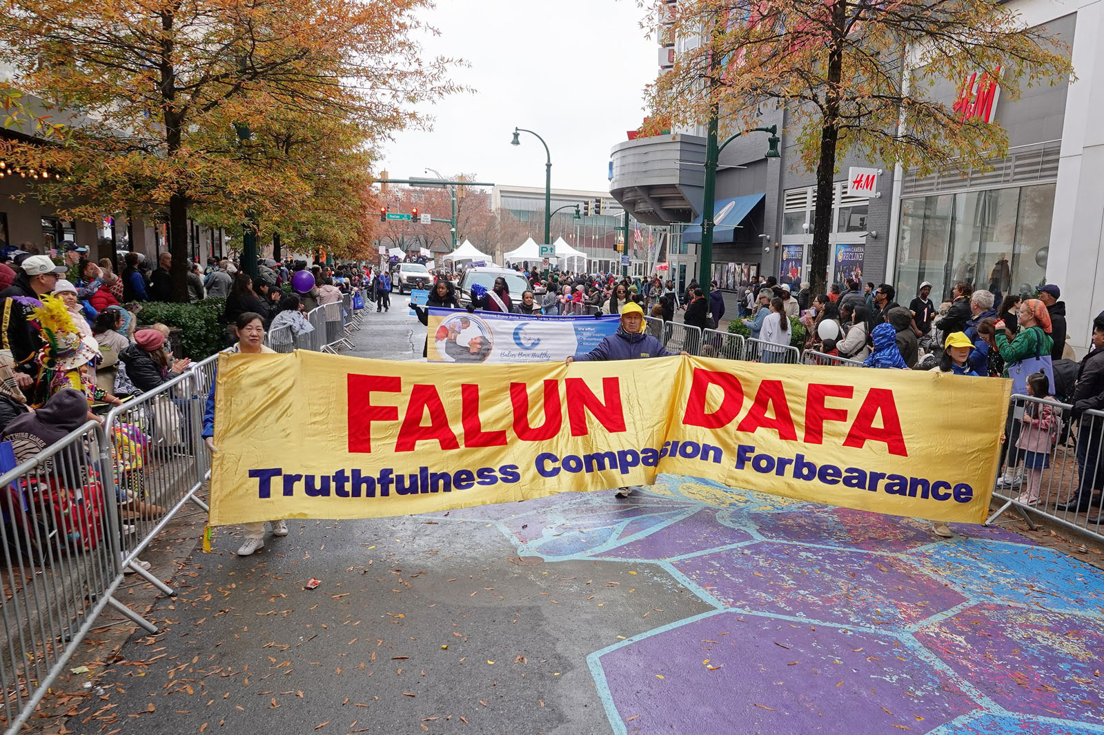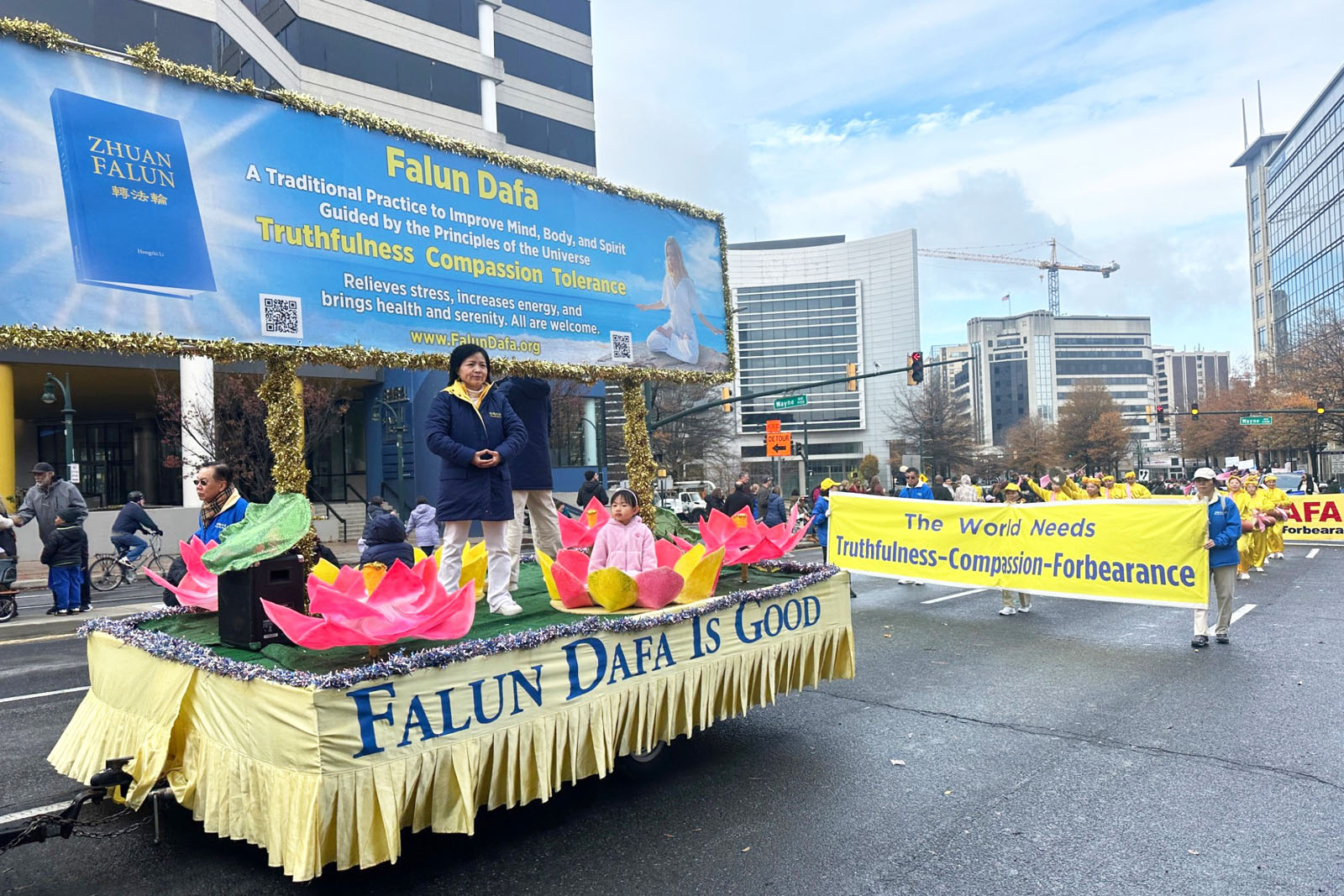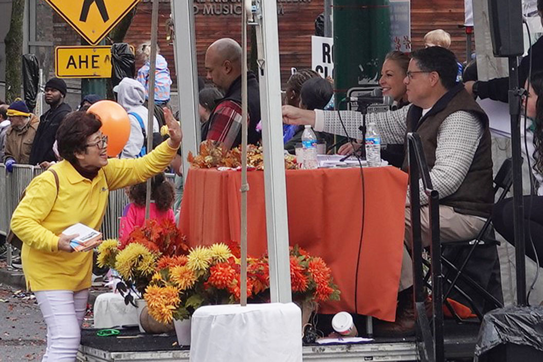 Falun Dafa practitioners participate in the Thanksgiving Parade.