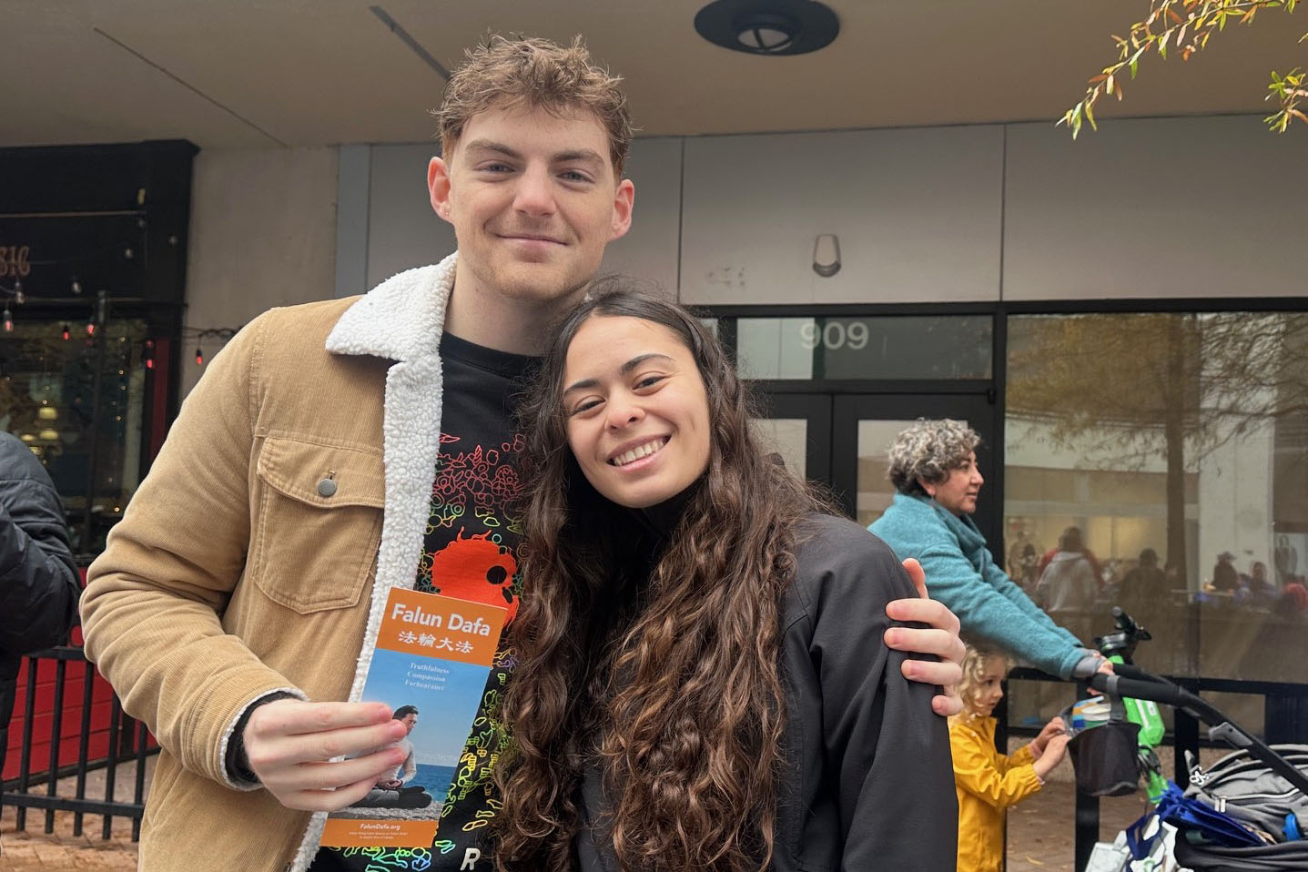 This was their first time hearing about Falun Dafa. Upon seeing the banner that read, “The World Needs Truthfulness-Compassion-Forbearance,” Eli said, “We need these principles so much. Really, I completely support it.” Allie also agreed.
