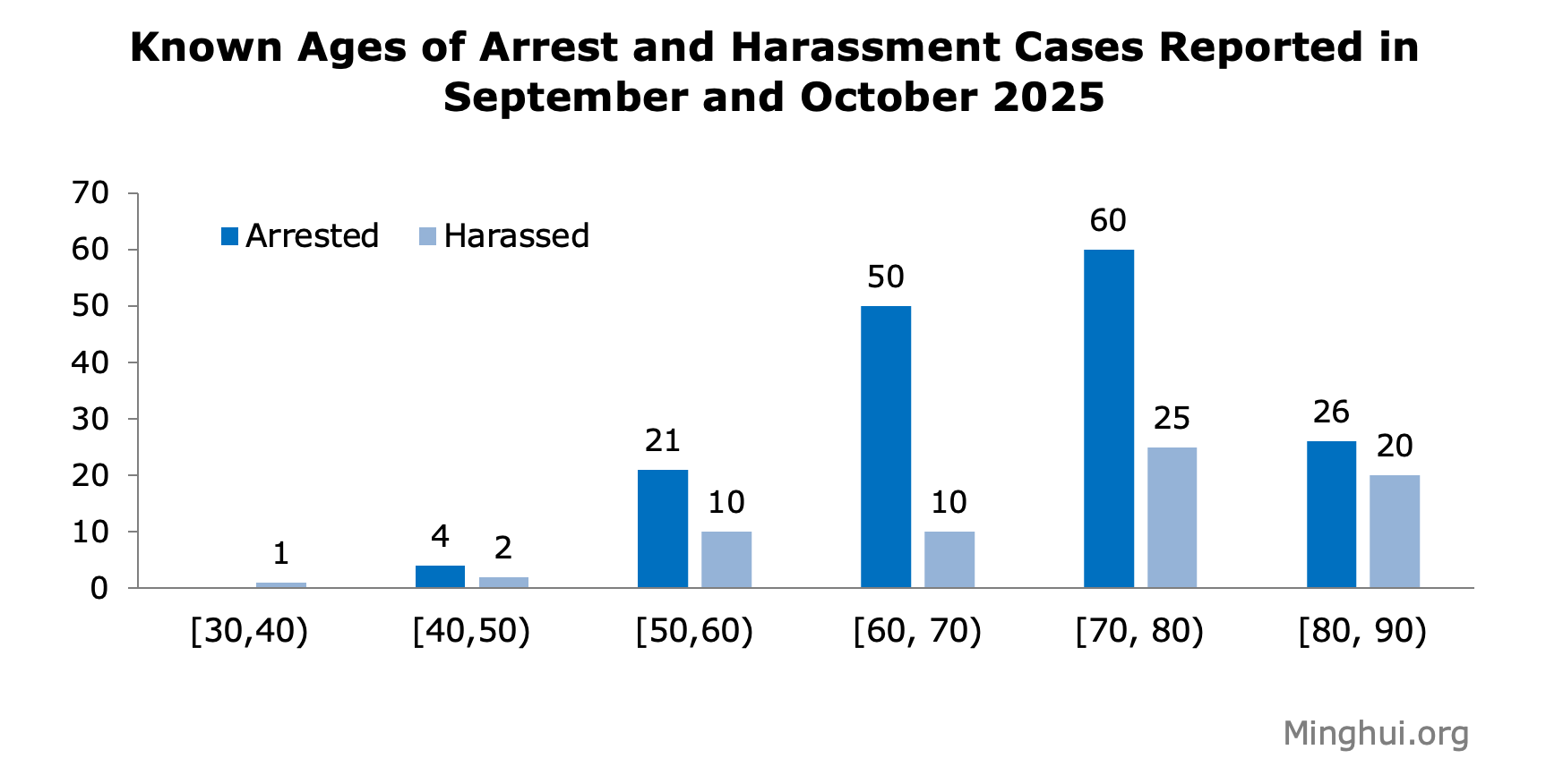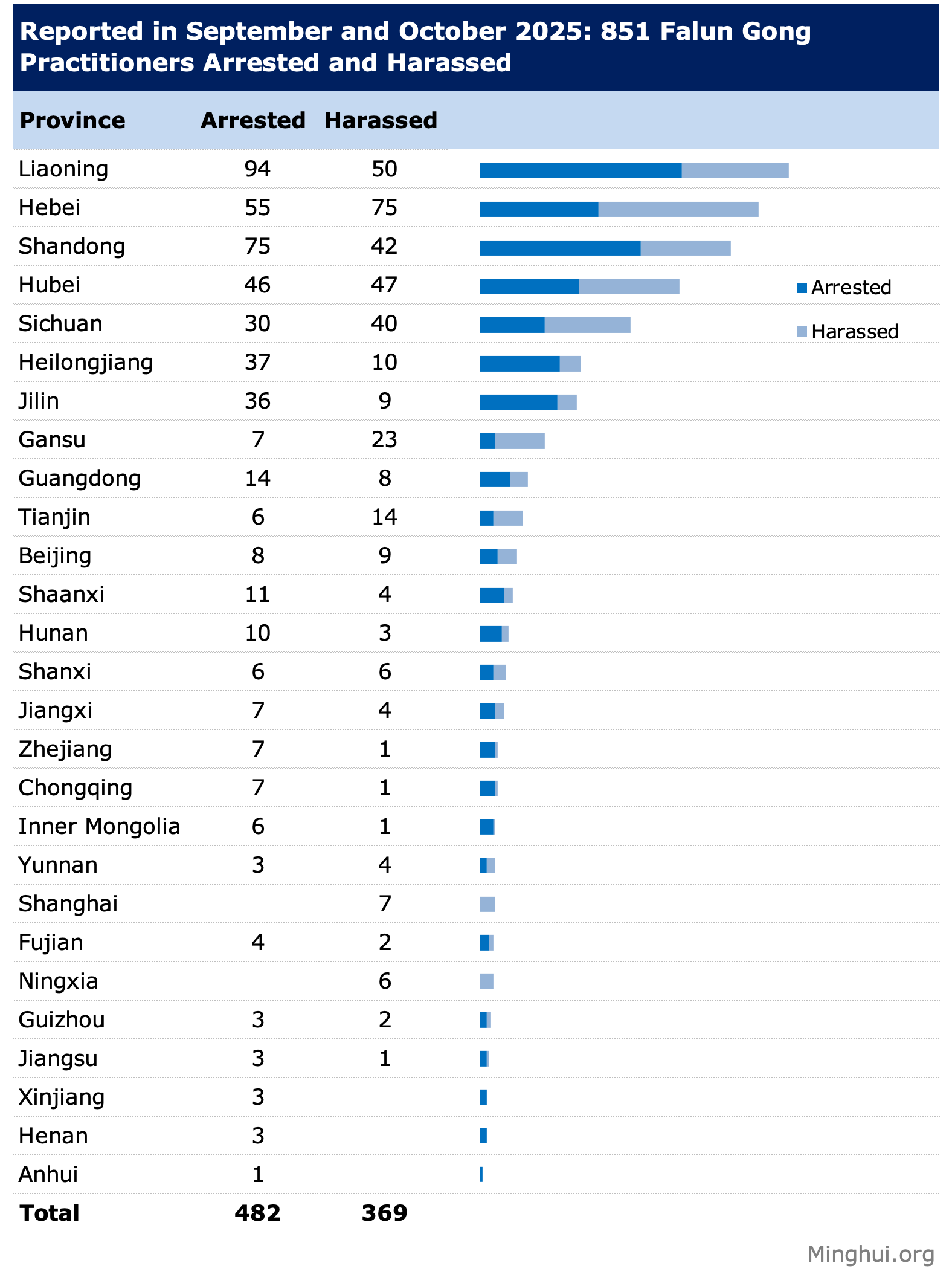 (Minghui.org) A total of 851 incidents of Falun Gong practitioners who were arrested or harassed for their faith were reported in September and October 2025.