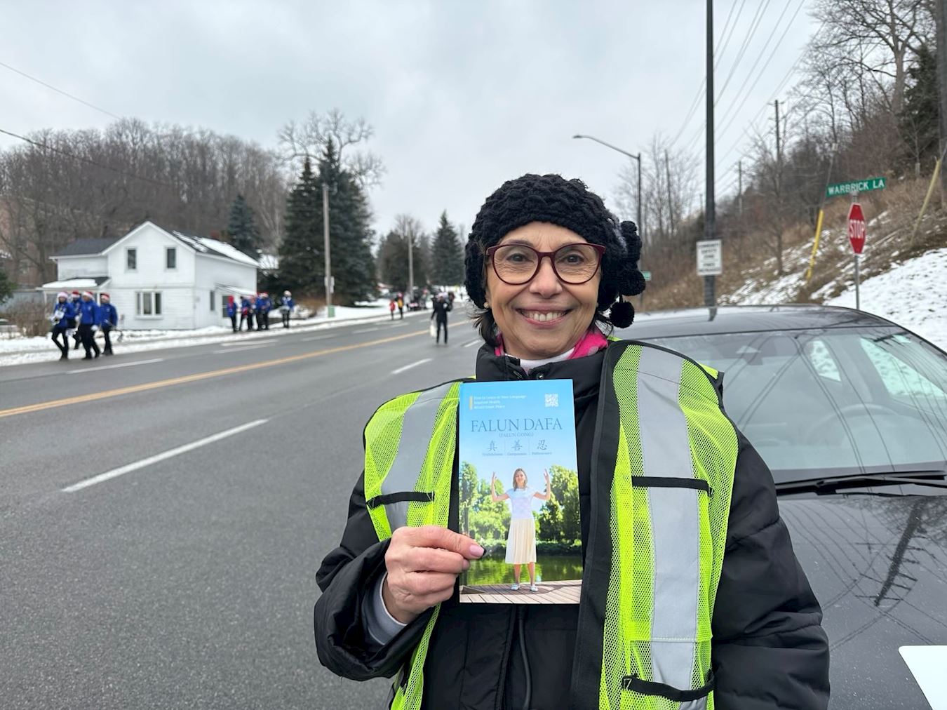 Carol, a real estate professional in Ajax, Ontario, participated in the parade in Ajax with her group. Before the parade, she noticed that the Tian Guo Marching Band members were doing the Falun Dafa exercises. She talked with a practitioner who told her about Falun Dafa’s principles of Truthfulness-Compassion-Forbearance, and she asked to be shown the exercises.