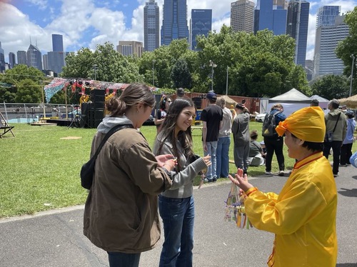 Many Chinese people of different ages were present. They included international students, elderly visitors from abroad, and immigrant families. An elderly Falun Dafa practitioner chatted with many predestined Chinese people. They were accepting and decided to withdraw from the Chinese Communist Party (CCP) and its youth organizations.