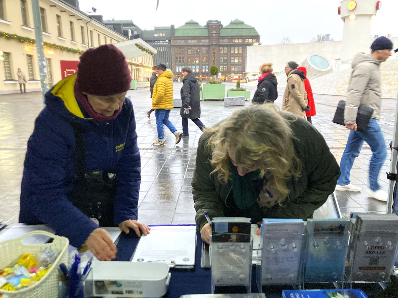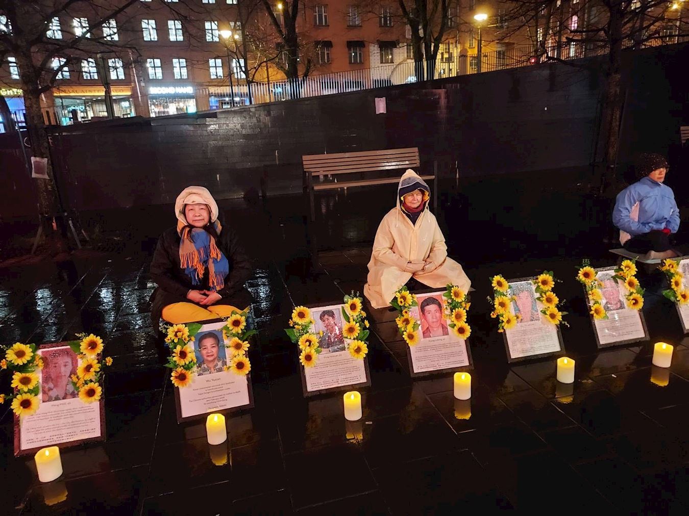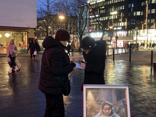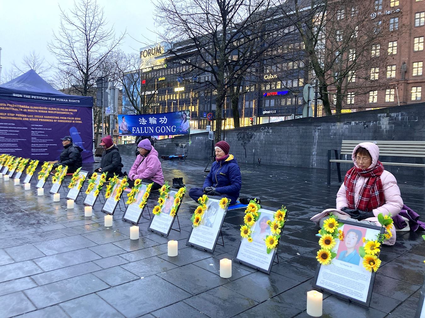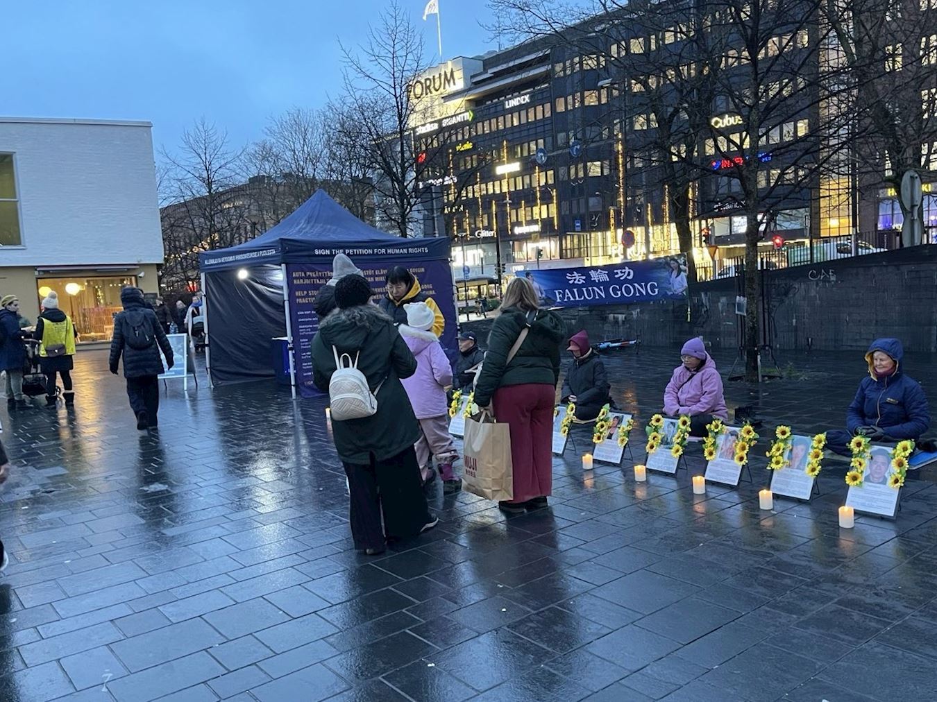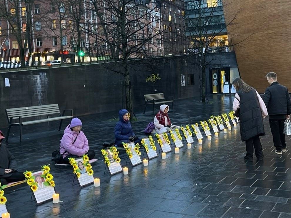 Portraits of practitioners who died as a result of the CCP’s persecution were displayed on the square. Some are relatives of practitioners in Finland. Lighted candles were placed before the portraits, and practitioners silently remembered their fellow practitioners who were persecuted to death. Many passersby were moved and paused to learn about the event and sign the petition. It rained two hours later. Some practitioners continued sitting in the rain, winning people’s empathy and respect.