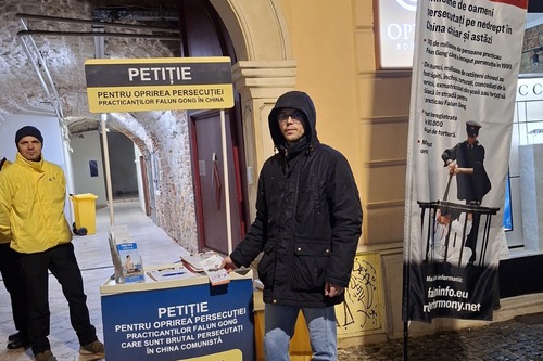 They demonstrated the Falun Dafa exercises at the practice site in Simion Bărnuțiu Central Park and set up an information booth on Eroilor Boulevard. They handed out calendars, informational brochures, and lotus flowers and talked to people about Falun Dafa. They also collected signatures on a petition calling for an end to the Chinese Communist Party’s (CCP) persecution.
