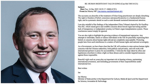 (Minghui.org) Practitioners in the UK held a candlelight vigil and peaceful protest near the Chinese Embassy in London on December 10, 2025 – International Human Rights Day. Ian Murray, Minister of State jointly in the Department for Culture, Media and Sport and the Department for Science, Innovation and Technology wrote a letter to express his support for practitioners’ resistance against the persecution.