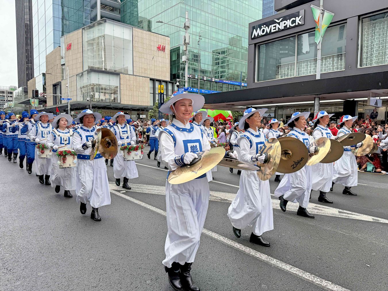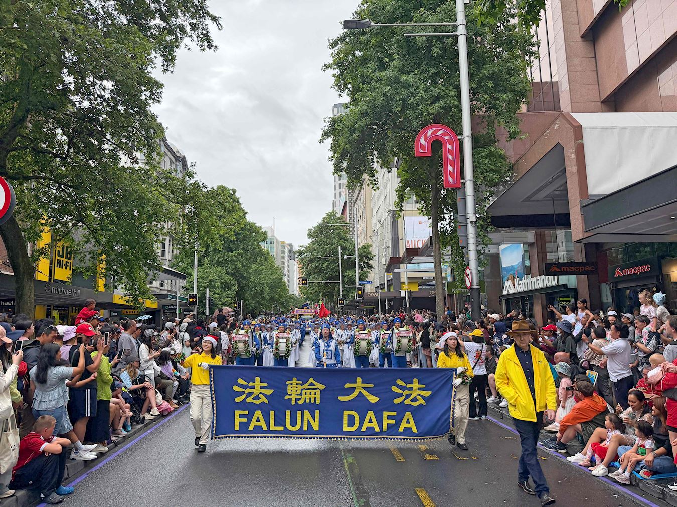 The Tian Guo Marching Band composed of Falun Dafa practitioners from New Zealand and Australia were greeted with warm applause. People took photos, complimented the band on their blue and white outfits, and said the band’s music blended perfectly with the event’s festive atmosphere. Eye-catching “Truthfulness-Compassion-Forbearance” banners decorated the float, which was followed by the dragon dance team, something the children really enjoyed.