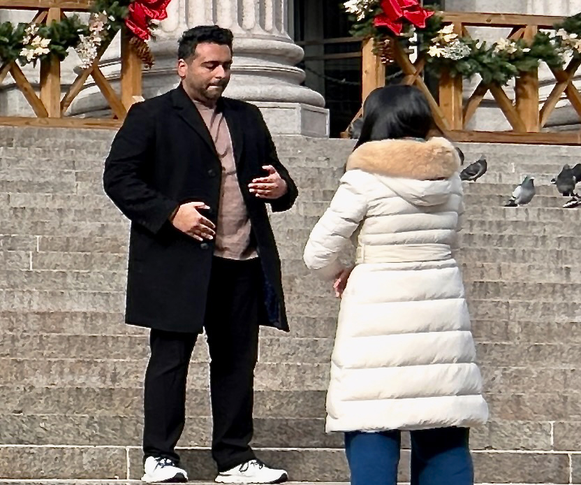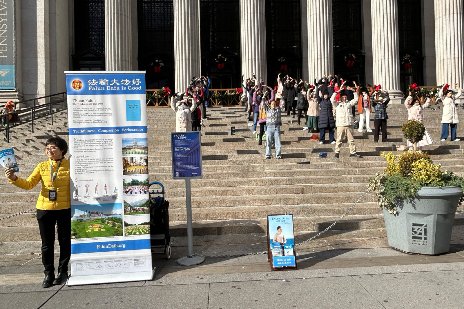(Minghui.org) November 27, 2025, was Thanksgiving Day. The annual celebration was held in Manhattan, New York and drew many people. Falun Dafa practitioners held activities in front of the United States Post Office on Eighth Street to introduce the spiritual practice to the public. The post office is across from Penn Station, New York’s main intercity railroad station and the destination of the Macy’s Thanksgiving Day Parade.