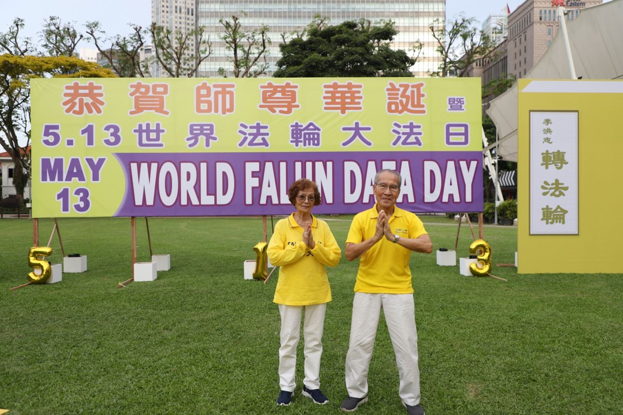 At the Taiwan clinic, they saw truth-clarification displays about Falun Dafa, including photos of large-scale group exercises and images of 5,000 people forming Chinese characters. These displays awakened memories in Mr. Yao, while his wife felt a peaceful and harmonious atmosphere. After a few visits, Mr. Yao gently encouraged her to try reading the teachings and learning the exercises.