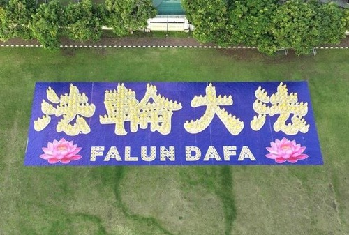 The character formation spanned 190 feet in length and 67 feet in width, with the upper section comprised of several hundred practitioners forming the Chinese characters “Falun Dafa.”