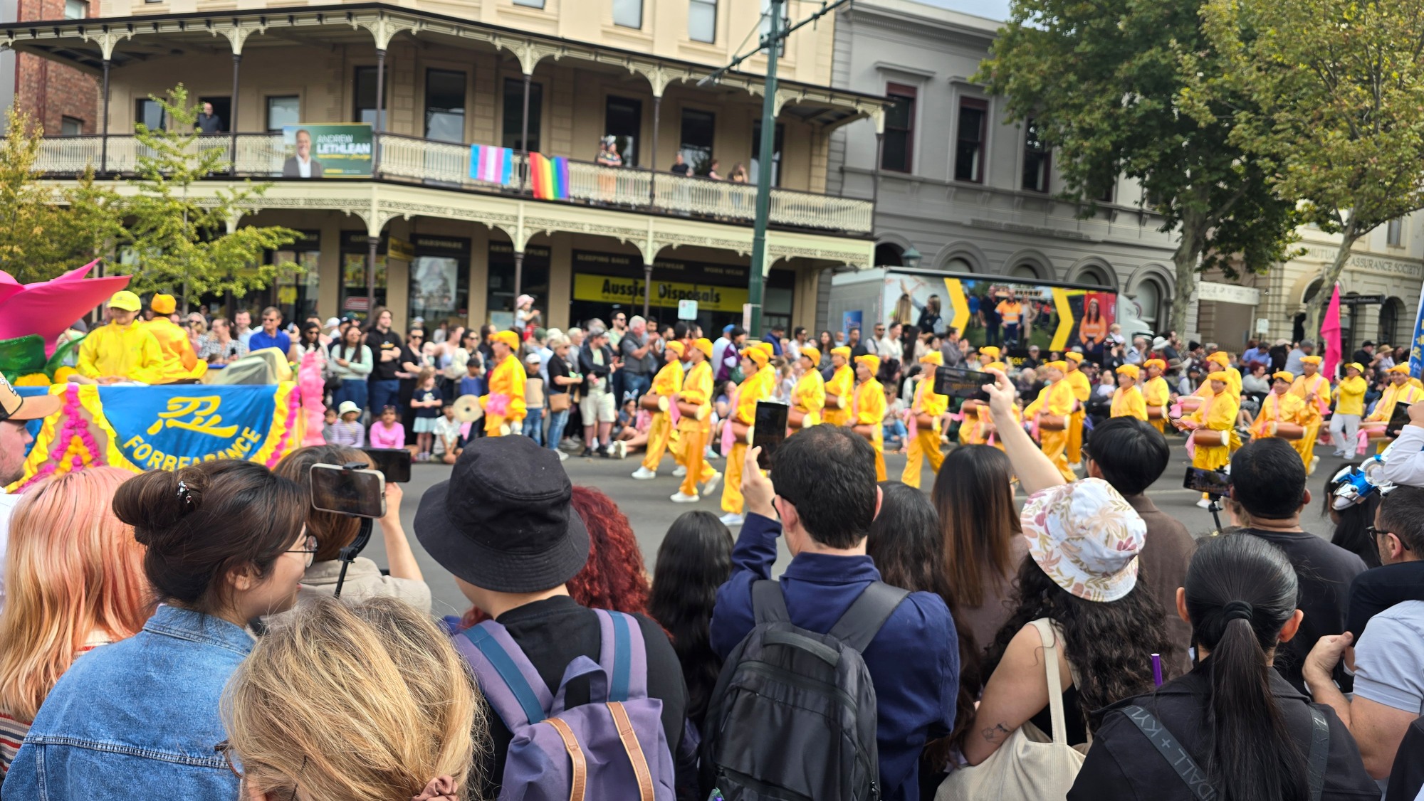 (Minghui.org) Practitioners participated in the annual Bendigo Easter Fair parade on April 20, 2025. Bendigo is the fourth largest city in Victoria State and has a rich cultural heritage. The Bendigo Easter Fair started in 1817 and is one of the oldest community fairs in Australia. The celebration lasts four days over the Easter long weekend. The parade draws many families from Melbourne and surrounding cities, as well as overseas tourists, every year.